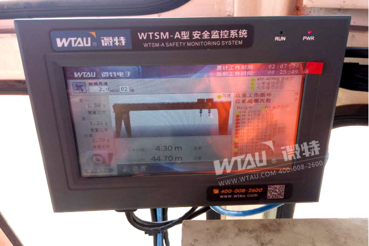 微特為中鐵十二局配備的WTSM-A-03型安全監(jiān)控系統(tǒng),滿足國家標(biāo)準(zhǔn)對提梁機安全監(jiān)控的要求,具有常用的通訊接口,有獨立并可擴展的I/O功能,整機數(shù)據(jù)采用Modbus或Profibus通訊,對吊機具有實時監(jiān)控、動態(tài)顯示、聲光報警、數(shù)據(jù)備份以及密碼保護等功能,且儀表自身具有抗干擾性強,操作界面好,通用性強等優(yōu)點。