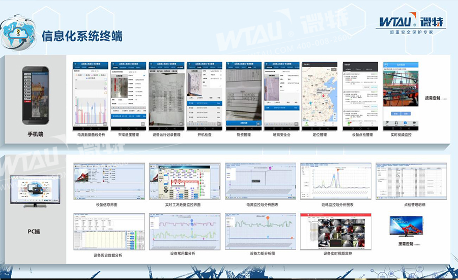 微特起重機信息化管理系統(tǒng),是在起重機安全監(jiān)控管理的基礎(chǔ)上結(jié)合中鐵集團(tuán)在運架施工管理上的特色而開發(fā)的信息化管理系統(tǒng)。系統(tǒng)集成了視頻遠(yuǎn)程、數(shù)據(jù)遠(yuǎn)程、手機錄入、拍照上傳、模擬動畫遠(yuǎn)程檢測與控制等信息化功能,實現(xiàn)了高鐵運架施工全過程的可視化與網(wǎng)絡(luò)化。