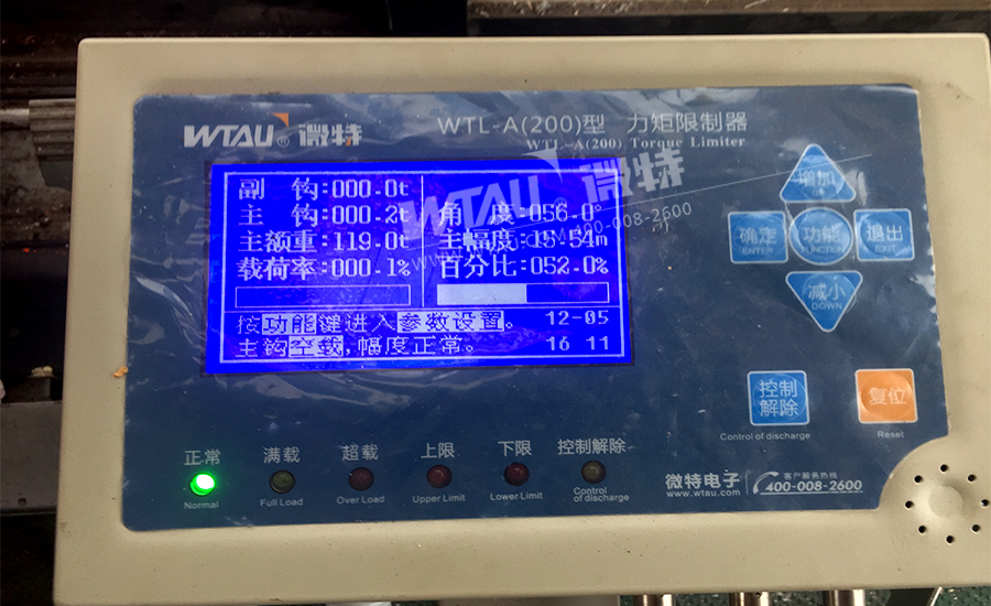 主機(jī)WTL-A200型力矩限制器儀表安裝在駕駛室里,該儀表可實(shí)時(shí)顯示當(dāng)前重量,幅度,角度,額重及工況等參數(shù)。