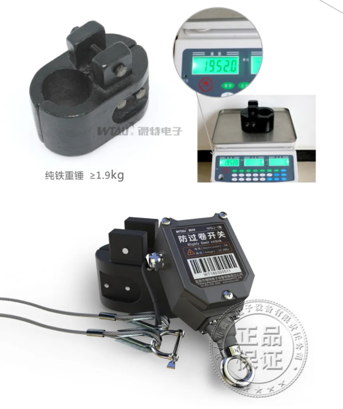 WGJ型防過卷開關(guān)(鉤頭限位開關(guān)/重錘限位開關(guān)),是用于起重機械鋼絲繩防過卷限位的一種電器自動保護開關(guān)。它與一適當(dāng)重量的重錘配套,利用吊鉤的上下運動托起或放下重錘時斷開或?qū)ㄩ_關(guān),實現(xiàn)自動切斷卷揚機動力電源連通剎車系統(tǒng),達到限制鋼絲繩過卷的目的,以及達到吊鉤在一定高度內(nèi)升降的目的。