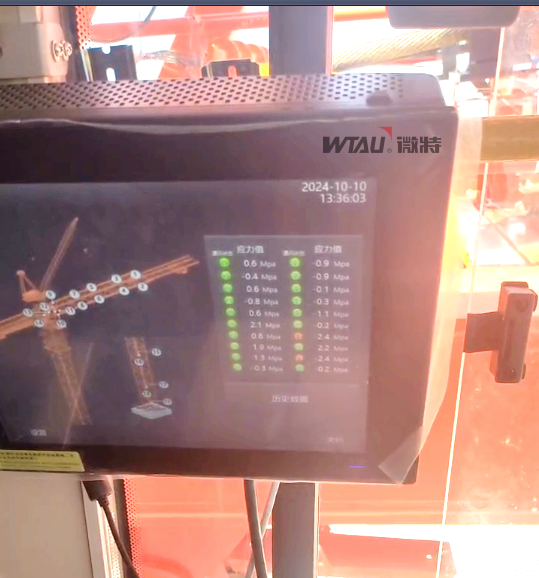 在交付儀式現(xiàn)場,相關(guān)負責人介紹道:“22000噸米級超大型塔機充分運用數(shù)字化、智能化、綠色化前沿技術(shù),基于視覺、雷達多模態(tài)融合的主動防護安全技術(shù)、大數(shù)據(jù)的塔機故障診斷技術(shù)等,塔機實現(xiàn)全域安全。”這些數(shù)字化、智能化前沿化技術(shù)應用,就包括微特研發(fā)的金屬結(jié)構(gòu)應力監(jiān)測系統(tǒng)。