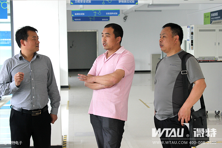 微特電子總經(jīng)理聶道靜對(duì)兩位遠(yuǎn)道而來(lái)的貴客表示歡迎,微特水電事業(yè)部經(jīng)理韓信與技術(shù)工程師劉普文向郭永崗、田國(guó)強(qiáng)詳細(xì)介紹了微特電子的發(fā)展歷程及產(chǎn)品技術(shù)。同時(shí)還一同來(lái)到微特建設(shè)的智能吊裝設(shè)備研發(fā)檢測(cè)中心,參觀高溫老化實(shí)驗(yàn)機(jī)、雷擊浪涌、靜電測(cè)試、振動(dòng)實(shí)驗(yàn)等實(shí)驗(yàn)檢測(cè)設(shè)備。這些實(shí)驗(yàn)設(shè)備是微特電子高品質(zhì)產(chǎn)品的保證,確保每一臺(tái)出廠(chǎng)的設(shè)備都是百分百合格。