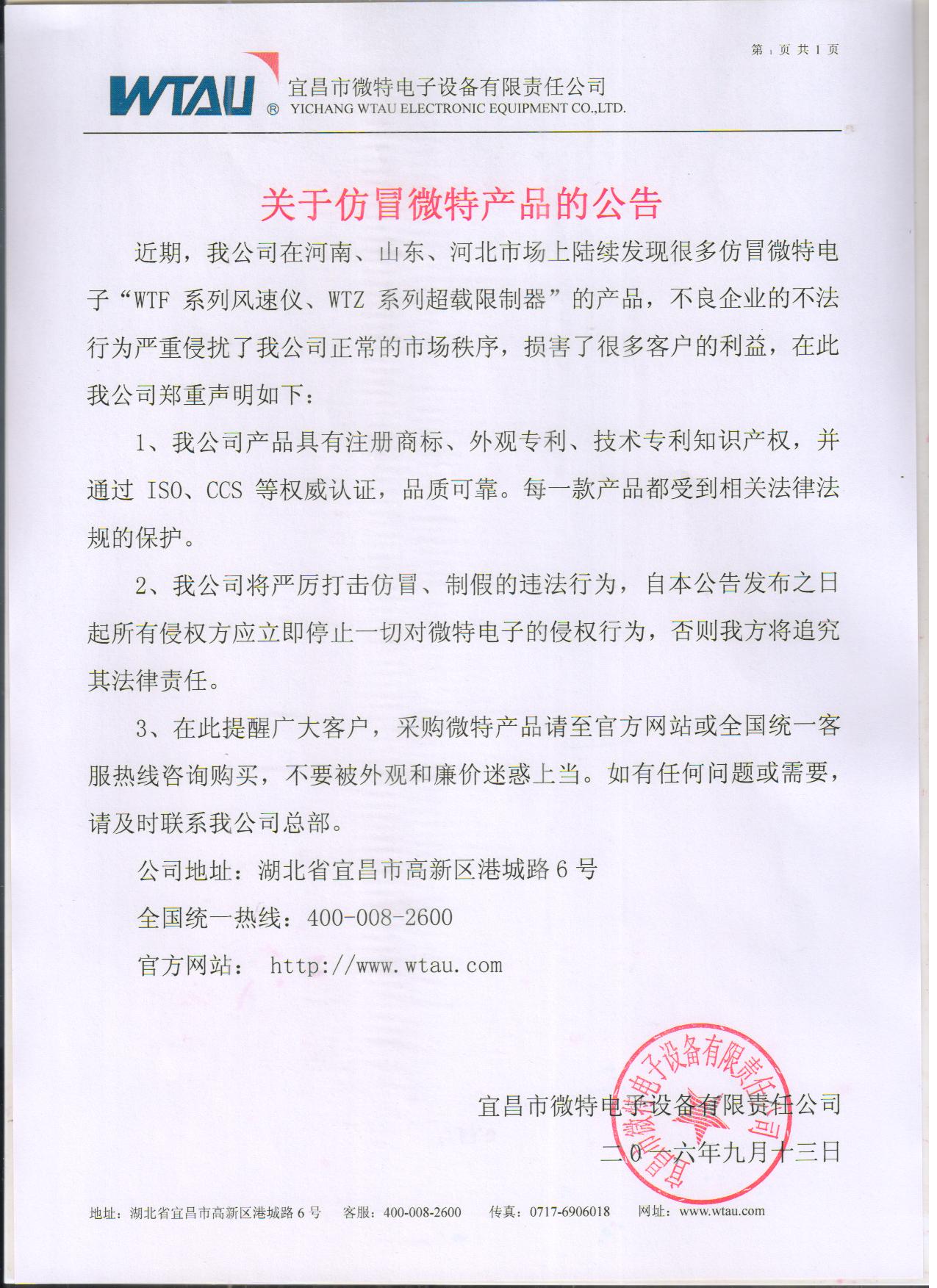 近期,我公司在河南、山東、河北市場上陸續(xù)發(fā)現(xiàn)很多仿冒微特電子“WTF系列風(fēng)速儀、WTZ系列超載限制器”的產(chǎn)品,不良企業(yè)的不法行為嚴(yán)重侵?jǐn)_了我公司正常的市場秩序,損害了很多客戶的利益,在此我公司鄭重聲明如下: