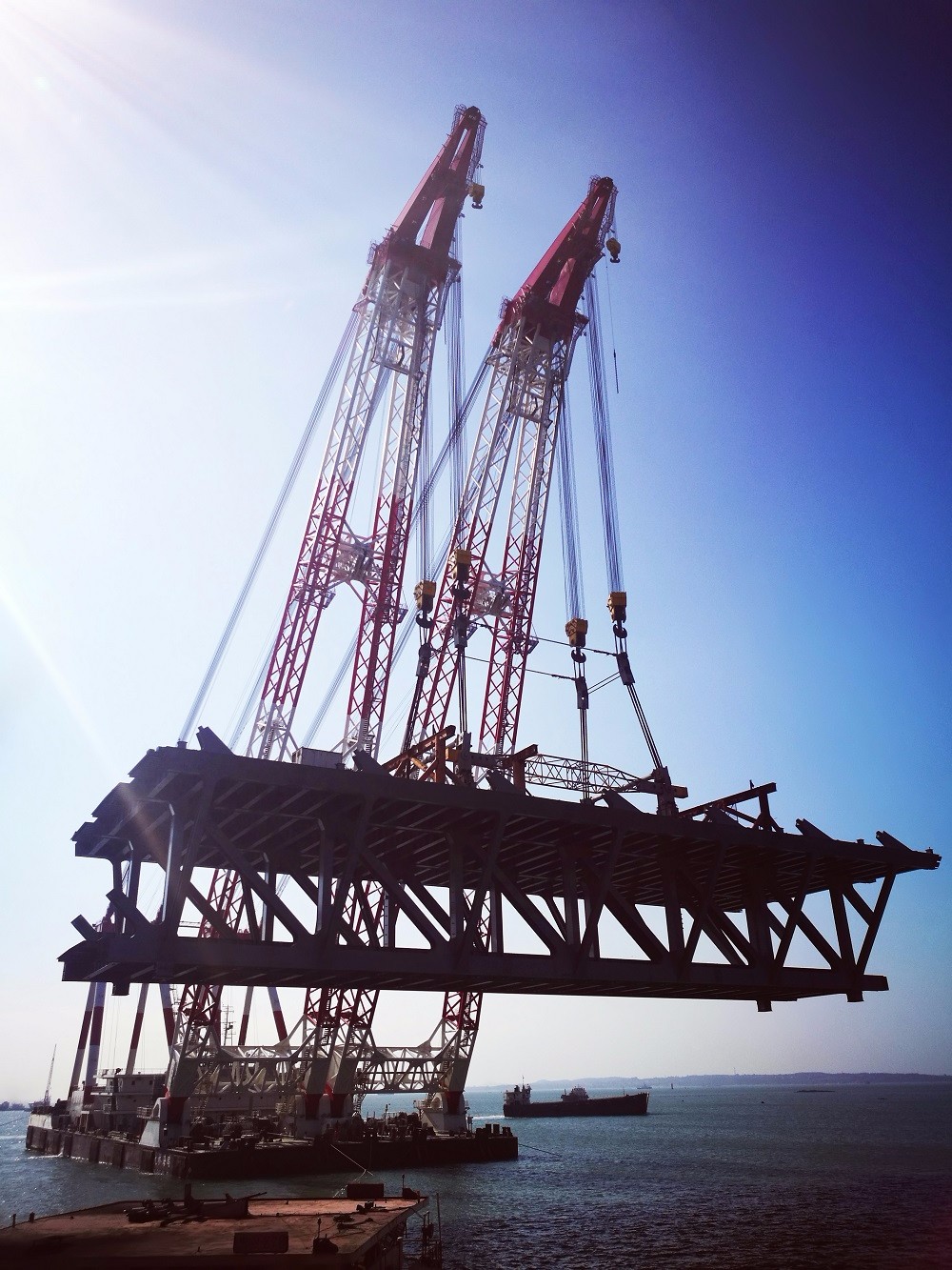 為克服惡劣自然環(huán)境,大橋施工采取鋼桁梁整孔全焊接制造,在工廠(chǎng)整體制造總拼,然后裝船從江蘇如皋歷經(jīng)約1000公里海上運(yùn)輸至橋位處,現(xiàn)場(chǎng)海上浮吊整孔架設(shè),為國(guó)內(nèi)首創(chuàng),填補(bǔ)了我國(guó)斜拉橋大節(jié)段鋼桁梁整孔吊裝架設(shè)的技術(shù)空白。本次吊裝的超級(jí)鋼桁梁長(zhǎng)96.25米,寬36.8米,相當(dāng)于8個(gè)籃球場(chǎng);高15.35米,相當(dāng)于5層樓;設(shè)計(jì)重量達(dá)3150噸,加上吊具起吊重量近3400噸,相當(dāng)于2260輛小汽車(chē)的重量。