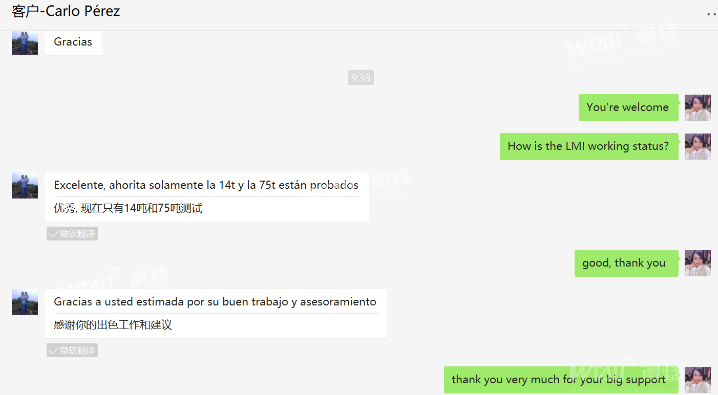 微特外貿(mào)經(jīng)理Riki收到來自中美洲尼加拉瓜客戶CARLO對微特力矩限制器產(chǎn)品的反饋, 并發(fā)來部分客戶自己安裝調(diào)試的產(chǎn)品圖片及吊車現(xiàn)場工作圖片。此次合作,微特協(xié)助客戶在14T隨車吊上安裝了WTL-A200力矩限制器以及在75T汽車吊安裝了WTL-A700型力矩限制器。 跟蹤產(chǎn)品使用狀態(tài)時,客戶給出了非常滿意的答復(fù)并對微特外貿(mào)經(jīng)理的合理選型及溝通建議表示感謝!