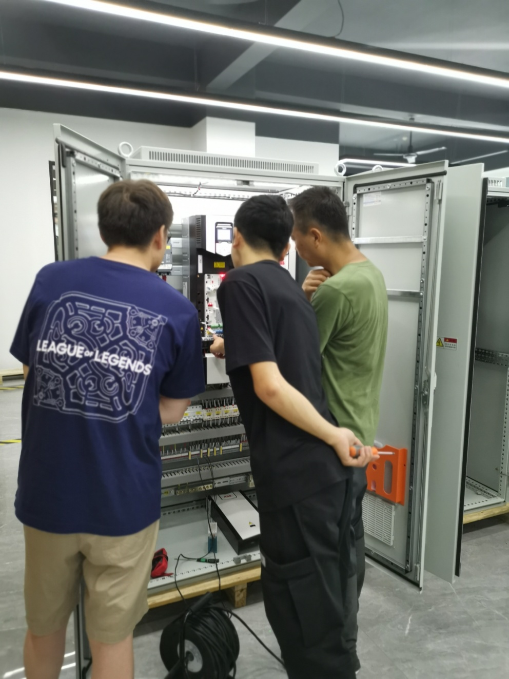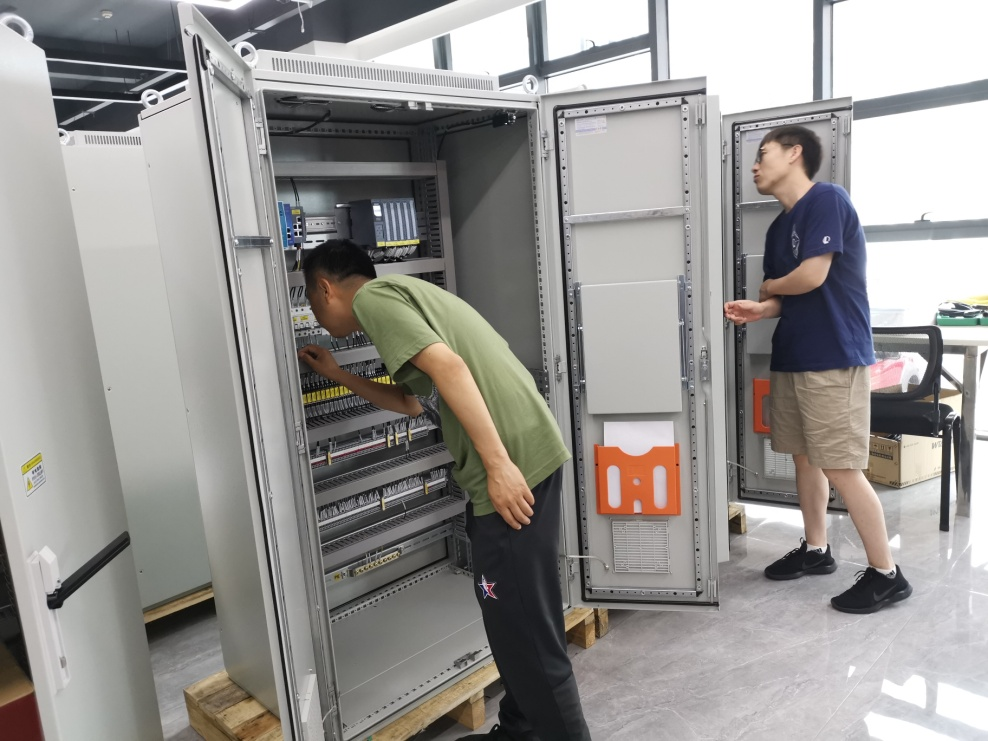 大朝山電站驗(yàn)收代表在微特電氣車間檢查盤(pán)柜生產(chǎn)工藝以及微特電氣工程師對(duì)變頻控制柜進(jìn)行上電試驗(yàn)