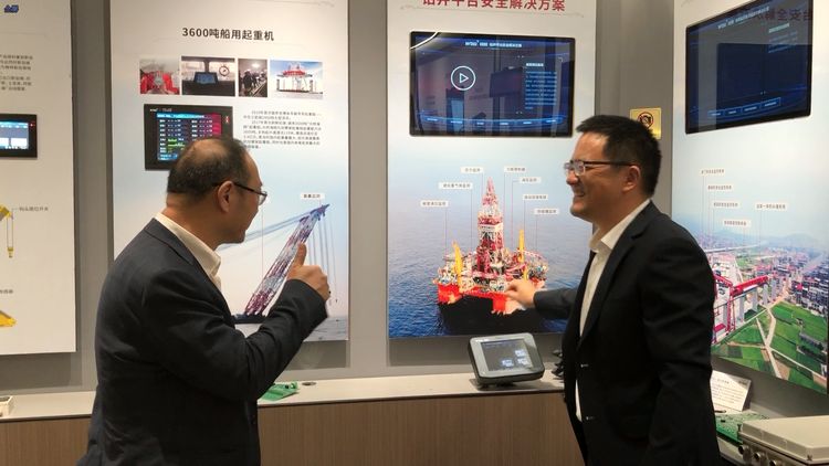 (在微特產(chǎn)品演示廳,聶道靜向金教授介紹行業(yè)應(yīng)用產(chǎn)品)