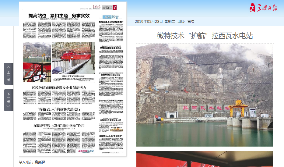 2019年5月28日,三峽日?qǐng)?bào)第A7版高新區(qū)專欄刊等圖文消息:微特技術(shù)“護(hù)航”拉西瓦水電站。