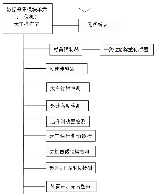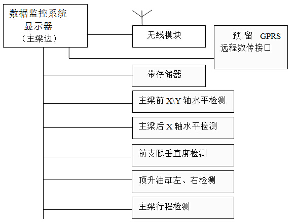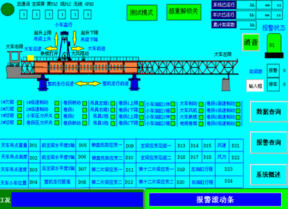 由于該拼裝架橋機(jī)的特殊性,本套系統(tǒng)方案配備有信號采集裝置(下位機(jī))1臺和一套圖形顯示終端含存儲(上位機(jī)),能夠?qū)崟r的顯示所監(jiān)控的各個參數(shù),并對所有的監(jiān)控對象能作出顯示、報警、數(shù)據(jù)分析、查詢、記錄及動作輸出等功能。數(shù)據(jù)保存能保存30個連續(xù)工作日。設(shè)備數(shù)據(jù)具有導(dǎo)出功能,通過USB口或網(wǎng)口可將數(shù)據(jù)導(dǎo)出作為長久保存用。設(shè)備具備遠(yuǎn)程通訊接口,可將數(shù)據(jù)和視頻通過GPRS或3G模塊將數(shù)據(jù)發(fā)至服務(wù)器,實現(xiàn)遠(yuǎn)程監(jiān)控。