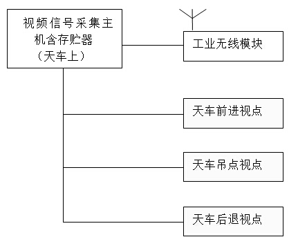 本方案視屏系統(tǒng)的配置結(jié)構(gòu)主要有:3路攝像頭和存儲器、、無線模組、顯示器等主體結(jié)構(gòu)構(gòu)成。主要監(jiān)視天車前行區(qū)域、天車后退區(qū)域、天車吊點區(qū)域的工作面為主要監(jiān)視區(qū)域,信號通過無線模塊傳輸至安裝在大梁上的視屏顯示器顯示
