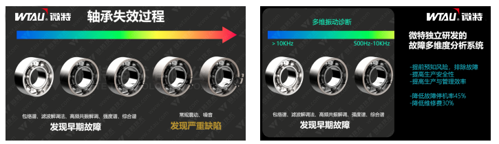目前市場(chǎng)上,一般通過常規(guī)振動(dòng)、噪音,才能發(fā)現(xiàn)軸承嚴(yán)重缺陷。微特獨(dú)立研發(fā)的故障多維度分析系統(tǒng),通過包絡(luò)譜、濾波解調(diào)法、高頻共振解調(diào)、強(qiáng)度譜、綜合譜,能在早期就發(fā)現(xiàn)軸承故障。能有效地提高生產(chǎn)安全性、提高生產(chǎn)與管理效率、降低故障停機(jī)率45%、降低維修費(fèi)30%,幫助企業(yè)降低生產(chǎn)、管理、運(yùn)營等成本,提升利潤。