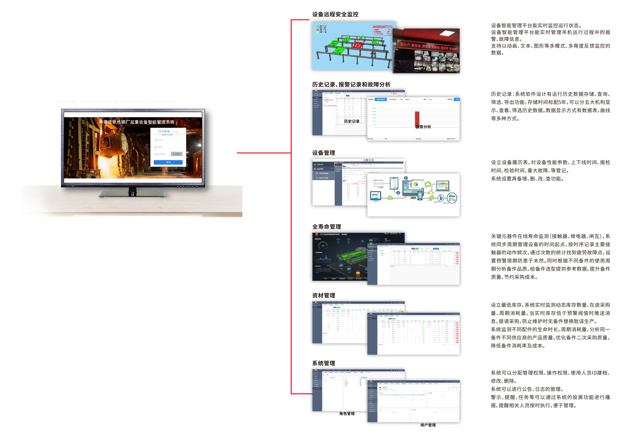 WTCIMS-V2.0系統(tǒng)針對(duì)起重機(jī)運(yùn)行設(shè)計(jì)了設(shè)備基礎(chǔ)信息、設(shè)備運(yùn)行管理、日狀態(tài)監(jiān)控、資材管理、系統(tǒng)管理五大功能模塊,解決起重機(jī)實(shí)時(shí)狀態(tài)監(jiān)測(cè)、資料歸檔、點(diǎn)檢維護(hù)保養(yǎng)、備件周期、隱患趨勢(shì)預(yù)測(cè)等全壽命周期的全過(guò)程閉環(huán)管理。