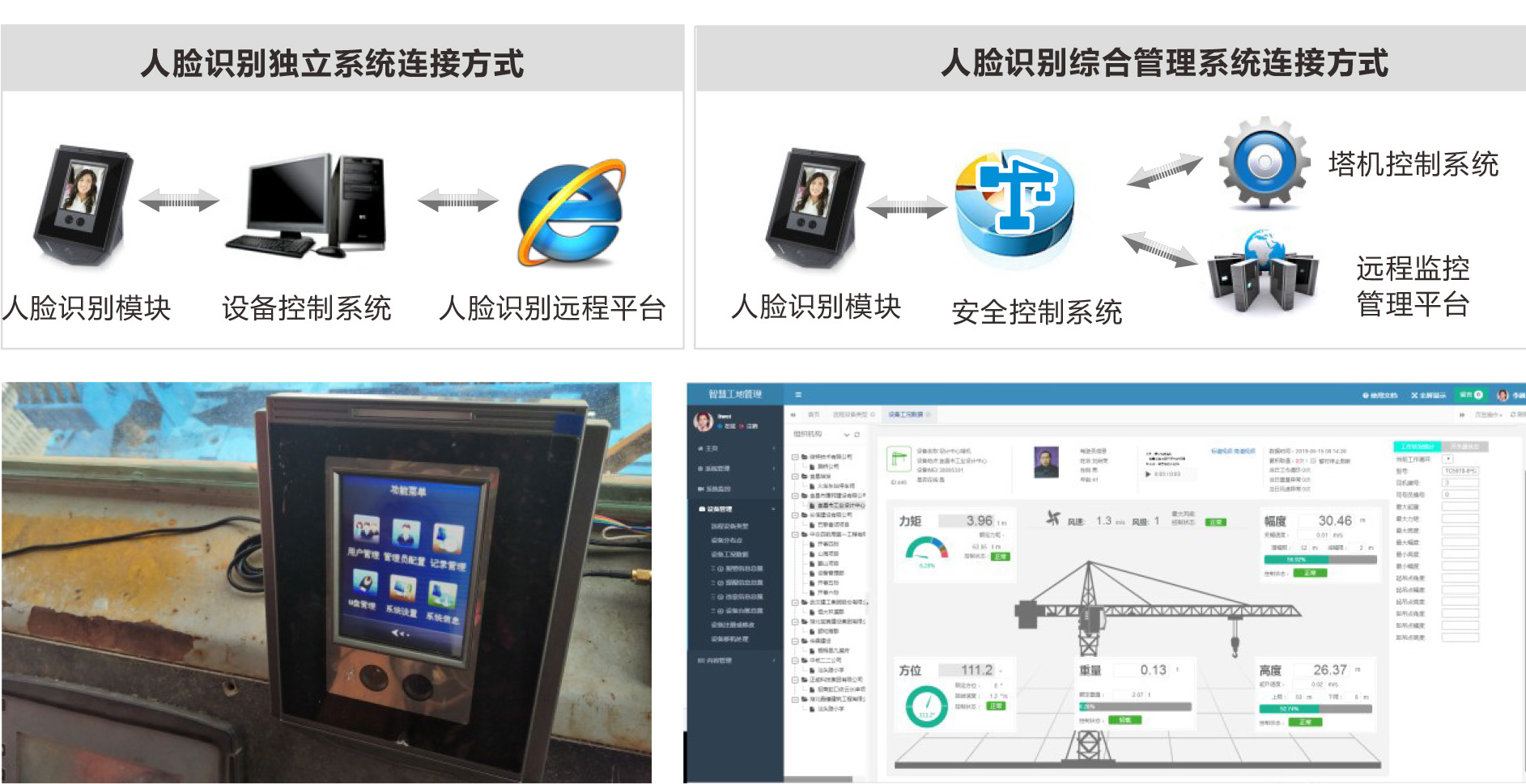 塔吊、升降機等專業(yè)設(shè)備需要專門的駕駛員來操作,操作人員必須持證上崗。有必要對駕駛員進行身份驗證,通過人臉識別模塊和點火開關(guān)相聯(lián),操作人員實現(xiàn)定人定崗,保證持證操作。防止非授權(quán)人員操作設(shè)備,避免危險的發(fā)生。