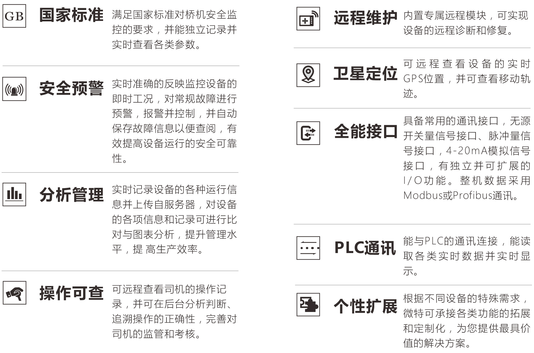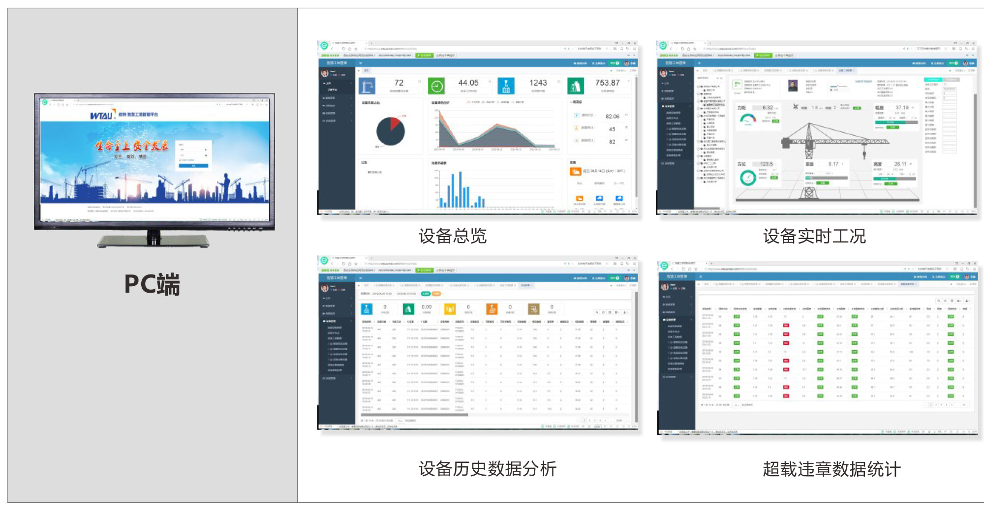 微特起重機遠(yuǎn)程安全監(jiān)控管理系統(tǒng),是微特公司根據(jù)國家《起重機安全監(jiān)控管理系統(tǒng)》新標(biāo)準(zhǔn)研制出來的,針對于各類架橋設(shè)備的改造及新標(biāo)準(zhǔn)的強制實施,同時也可用于其他領(lǐng)域各類起重施工設(shè)備。該系統(tǒng)對設(shè)備的運行進行全方位的安全實時監(jiān)控,避免因操作者的疏忽或失誤而造成的安全事故,有效地保證設(shè)備的安全使用。