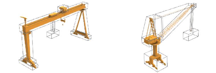 將關(guān)聯(lián)的吊機(jī)模型帶入船塢場地模型中,以船塢空間為統(tǒng)一坐標(biāo)系,軌道方向為X軸,在船塢空間數(shù)學(xué)模型中真實的反應(yīng)各吊機(jī)的位置、臂架方位、吊鉤高度等關(guān)鍵信息。