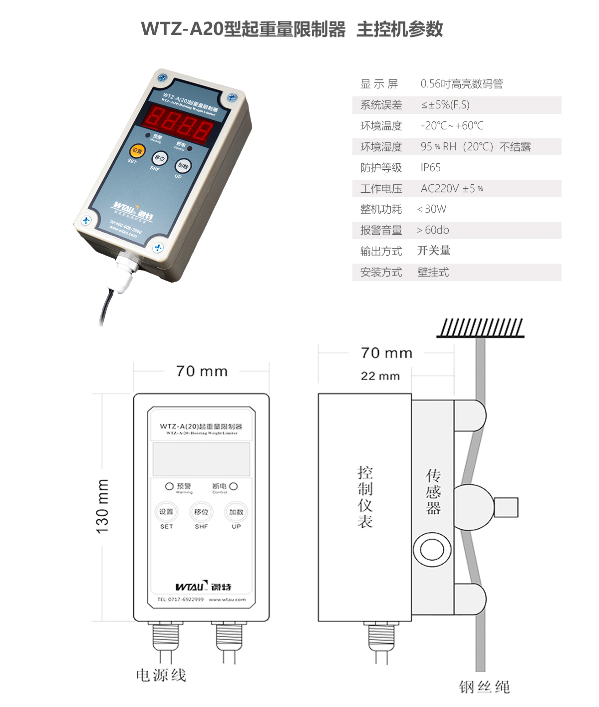 WTZ-A20起重量限制器用于一路重量信號監(jiān)測,適用于升降機、電動葫蘆等鋼絲繩置吊的起重設備。該型號儀表可替換WTZ-A50、WTZ-A60起重量限制器使用。