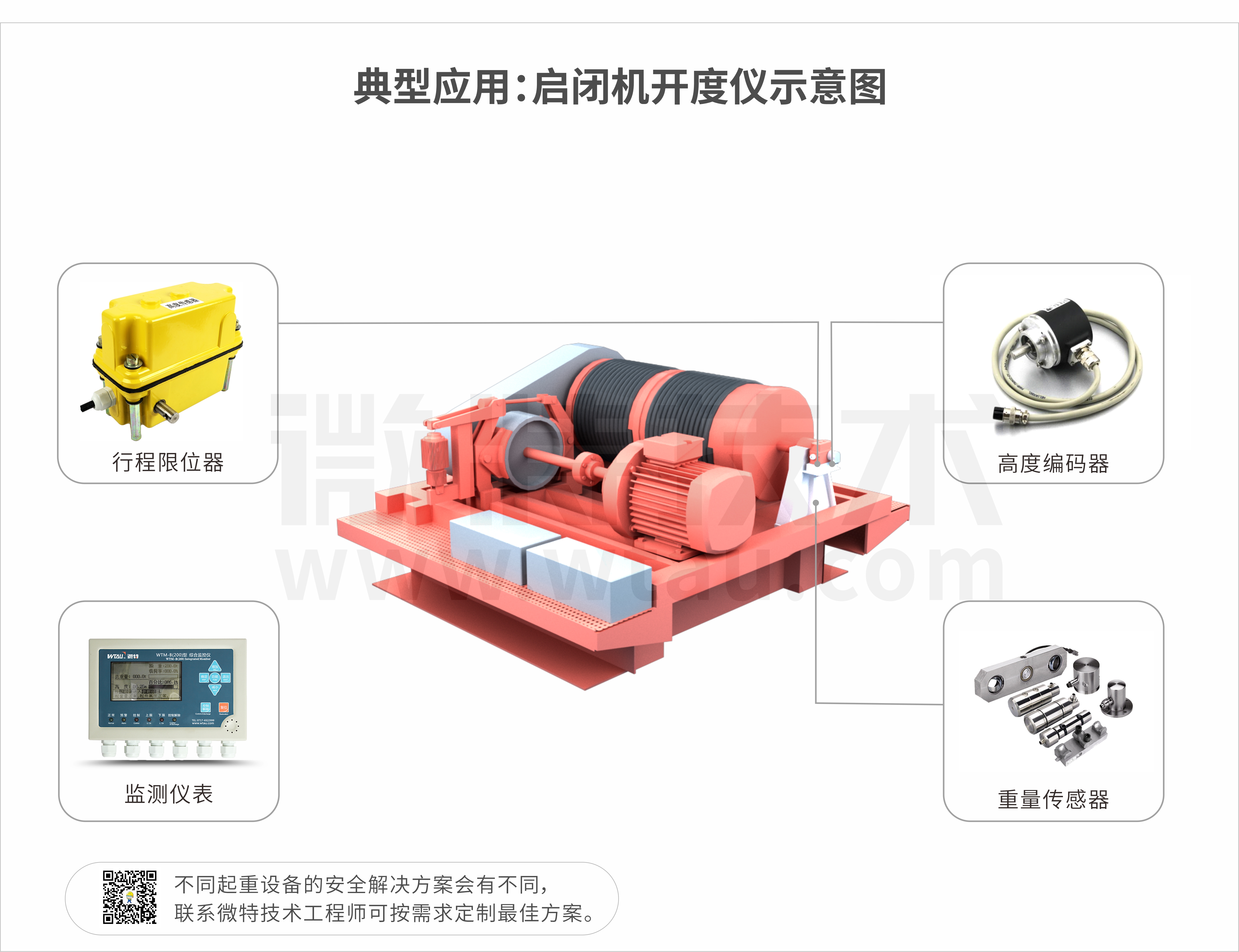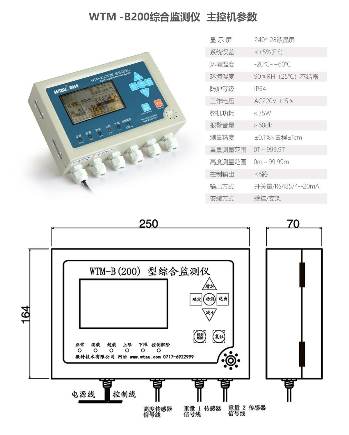 WTM-B200水電站綜合監(jiān)控儀可以輸入重量、高度、風速、風向、角度、幅度、溫度等信號,最多可輸出6個繼電器控制。適用于卷揚啟閉機多路重量及開度信號的控制。