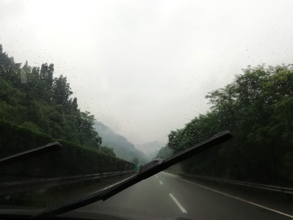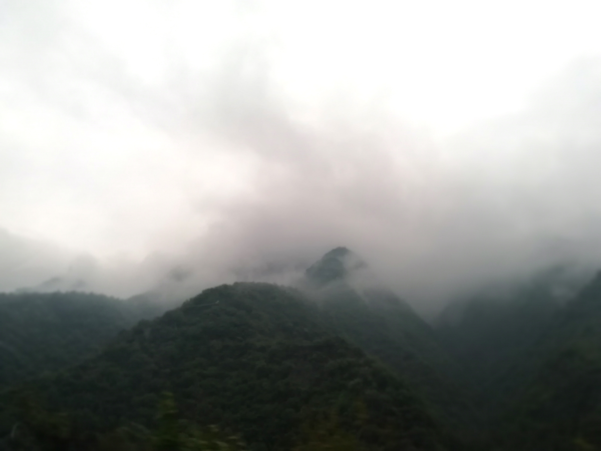 山上的路,和三年前一樣,一路上有大卡車在運送著泥土或石子。有兩處工地,在做塌方修復施工。雨慢慢也下大了,逐漸的山里霧氣彌漫,能見度不足100米,車速越來越慢了。