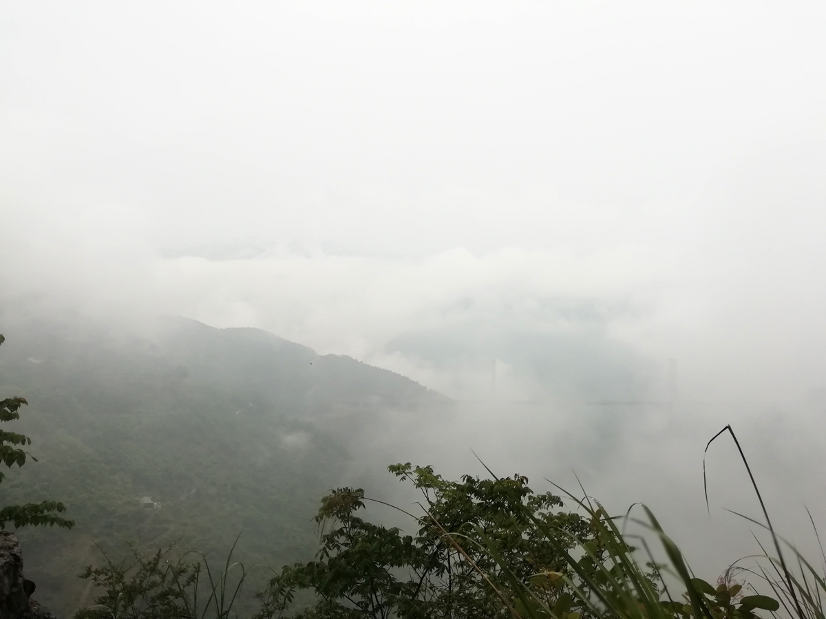 路邊便是陡峭的崖壁,可以隱約地看到遠處有一座橋梁橫跨在兩山之間,云霧之中,破為壯觀。這里的空氣,讓人有一種久違的感覺。