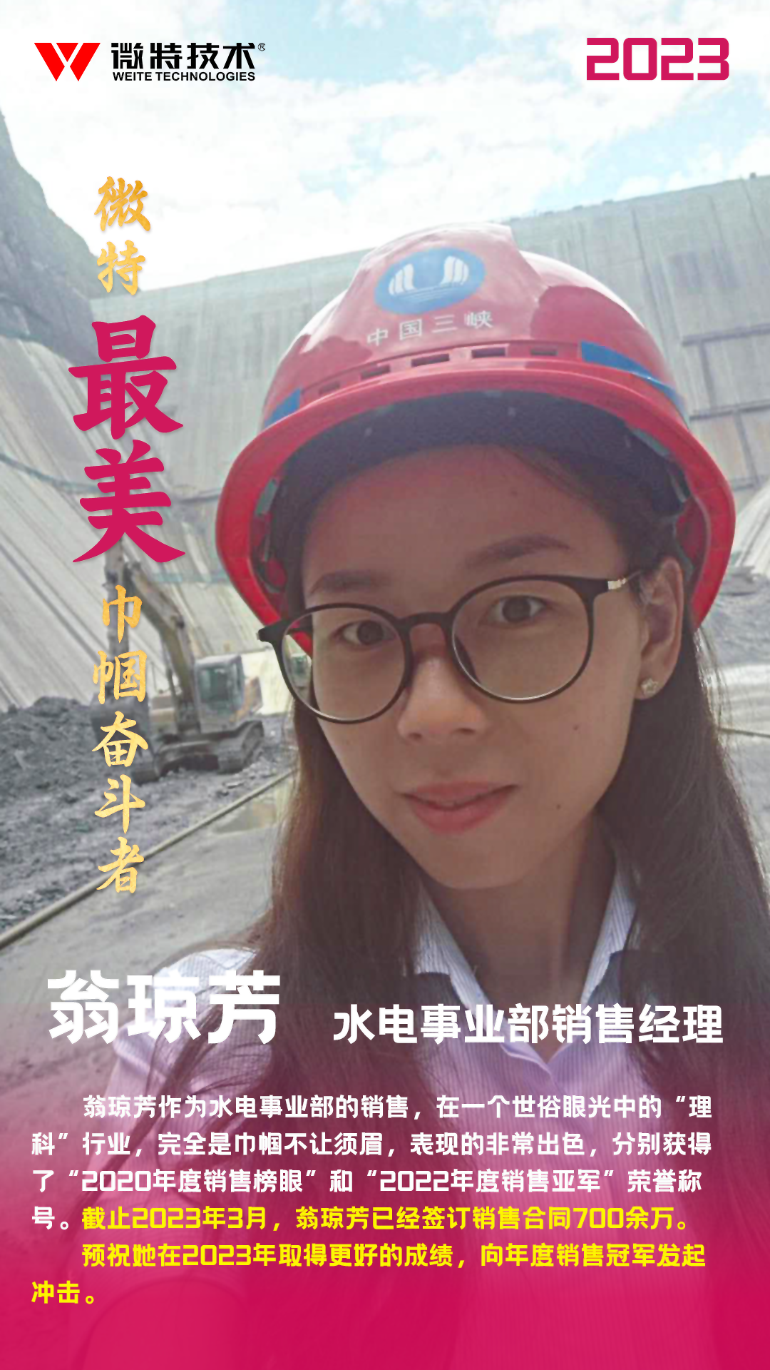 我想起微特公司 “一直致力于為客戶提供有價(jià)值的產(chǎn)品和服務(wù),為客戶提供更加安全可靠的解決方案”的理念與宗旨,原來(lái)已經(jīng)潤(rùn)物細(xì)無(wú)聲的浸透到每一位微特人的骨子里。而翁瓊芳作為水電事業(yè)部的銷(xiāo)售,在一個(gè)世俗眼光中的“理科”行業(yè),完全是巾幗不讓須眉,表現(xiàn)的非常出色,分別獲得了“2020年度銷(xiāo)售榜眼”和“2022年度銷(xiāo)售亞軍”榮譽(yù)稱(chēng)號(hào)。截止2023年3月,翁瓊芳已經(jīng)簽訂銷(xiāo)售合同700余萬(wàn),我也預(yù)祝她在2023年取得更好的成績(jī),向年度銷(xiāo)售冠軍發(fā)起沖擊。
