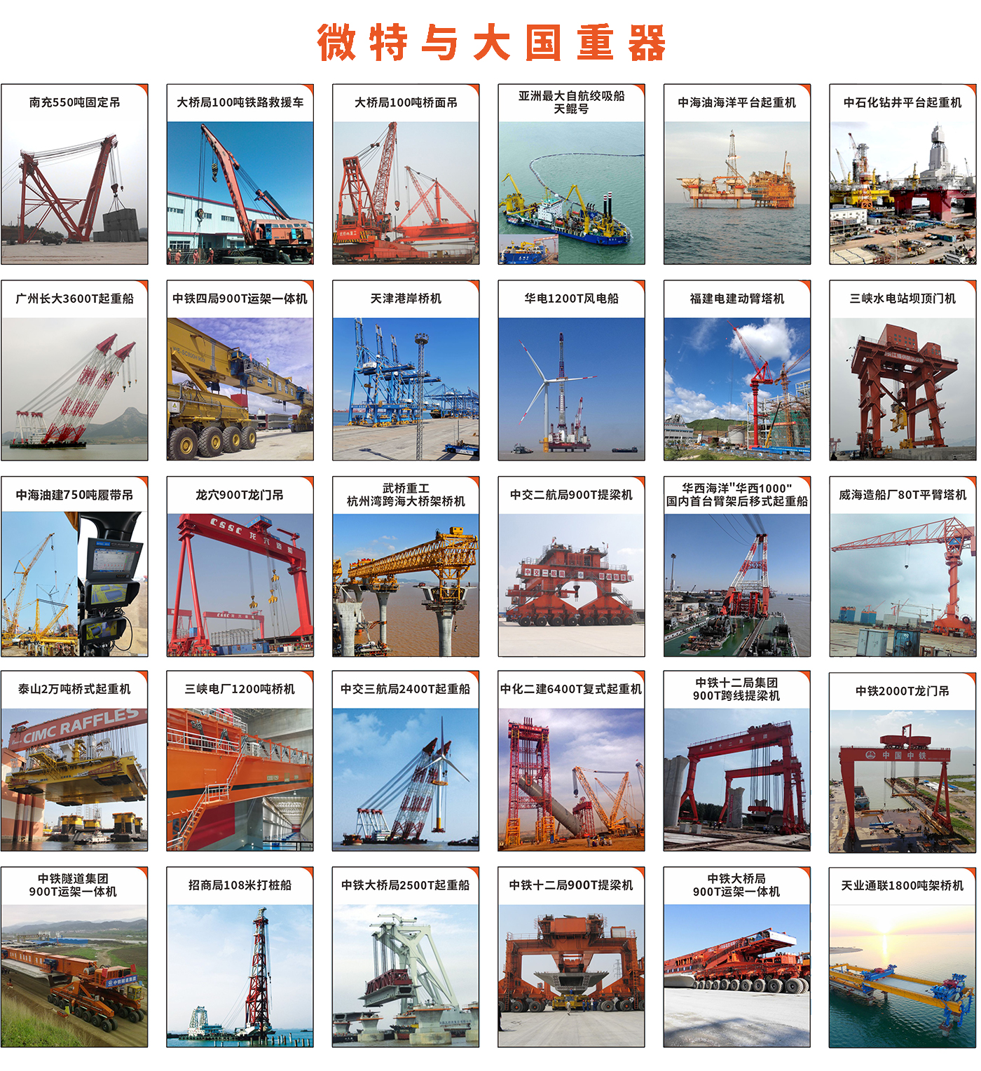 創(chuàng)立以來,微特在三峽大壩,港珠澳大橋,北盤江大橋,洋山港,高鐵架設(shè),南水北調(diào)等超級工程起重設(shè)備的安全解決方案中攻堅(jiān)克難。在大橋海鷗3600T起重船、天鯤號絞吸船、泰山20000T橋式起重機(jī)、中鐵2000T龍門吊、900T運(yùn)架一體機(jī)、利勃海爾750T履帶吊等大型重要起重設(shè)備上一次次挑戰(zhàn)更安全、更可靠的智能化解決方案。
