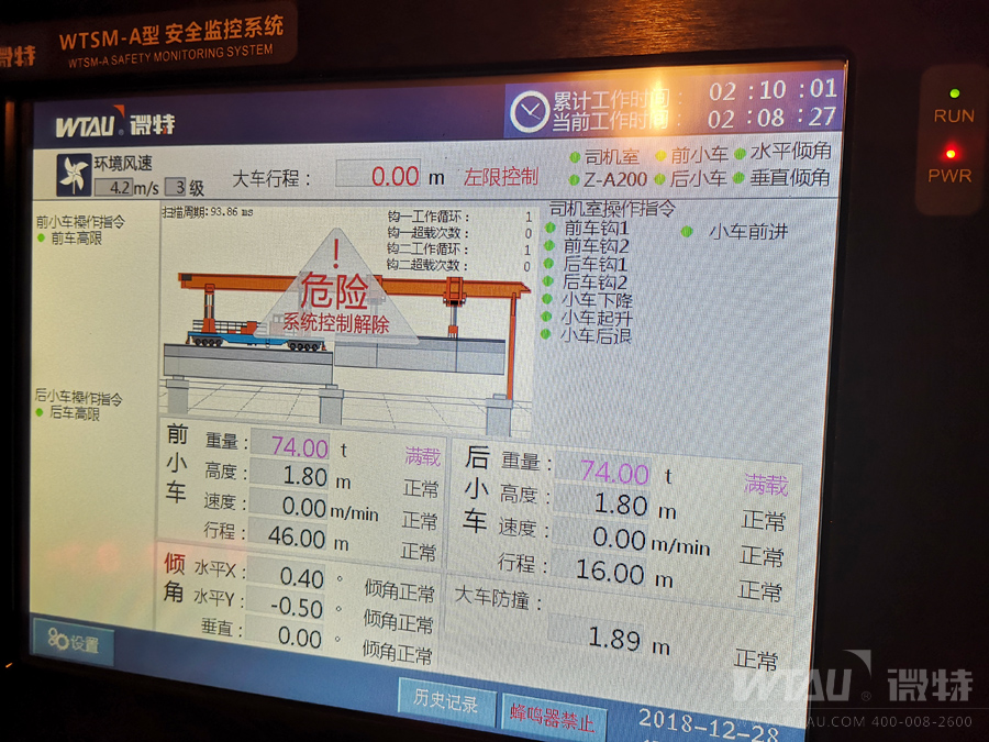 架橋機(jī)操作室中配裝有微特安全監(jiān)控系統(tǒng)顯示屏、超載限制器及視頻監(jiān)控顯示器