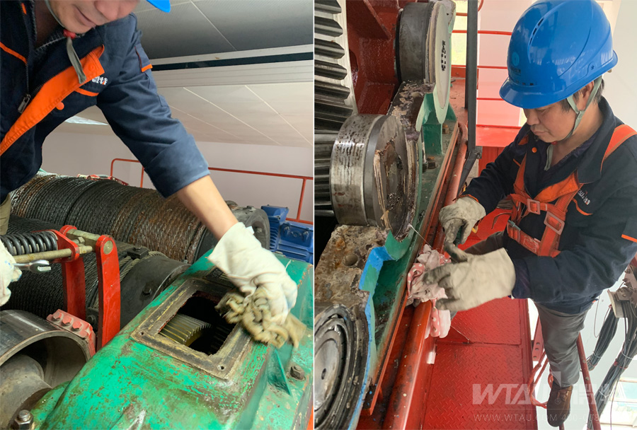 本次維護主要是對芭蕉河一級、二級站廠房橋機進行全面檢查維護作業(yè),并針對老設(shè)備存在的安全隱患問題,提出了針對性的處理意見,電廠對我方提出的處理方案積極響應,經(jīng)過技術(shù)討論,對兩臺橋機減速箱內(nèi)老化油脂進行全部更換、電氣回路進行問題排查處理,加裝安全保護裝置及儀表。