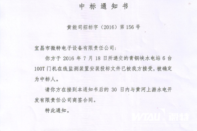 8月5日,公司市場部傳過來喜訊,公司收到了青海黃河上游水電開發(fā)有限責任公司發(fā)來的“青銅峽水電站6臺100T門機在線監(jiān)測裝置安裝項目”中標通知書,確認我公司為的中標人。本項目作為公司本年度的重點項目,由市場部負責具體跟進,經(jīng)過細心的研究和精心準備,最終在9家投標單位中脫穎而出,所遞交的投標文件被黃河上游水電開發(fā)有限責任公司接受,并最終確認為中標人。