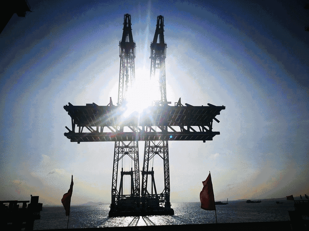 為克服惡劣自然環(huán)境,大橋施工采取鋼桁梁整孔全焊接制造,在工廠(chǎng)整體制造總拼,然后裝船從江蘇如皋歷經(jīng)約1000公里海上運(yùn)輸至橋位處,現(xiàn)場(chǎng)海上浮吊整孔架設(shè),為國(guó)內(nèi)首創(chuàng),填補(bǔ)了我國(guó)斜拉橋大節(jié)段鋼桁梁整孔吊裝架設(shè)的技術(shù)空白。本次吊裝的超級(jí)鋼桁梁長(zhǎng)96.25米,寬36.8米,相當(dāng)于8個(gè)籃球場(chǎng);高15.35米,相當(dāng)于5層樓;設(shè)計(jì)重量達(dá)3150噸,加上吊具起吊重量近3400噸,相當(dāng)于2260輛小汽車(chē)的重量。