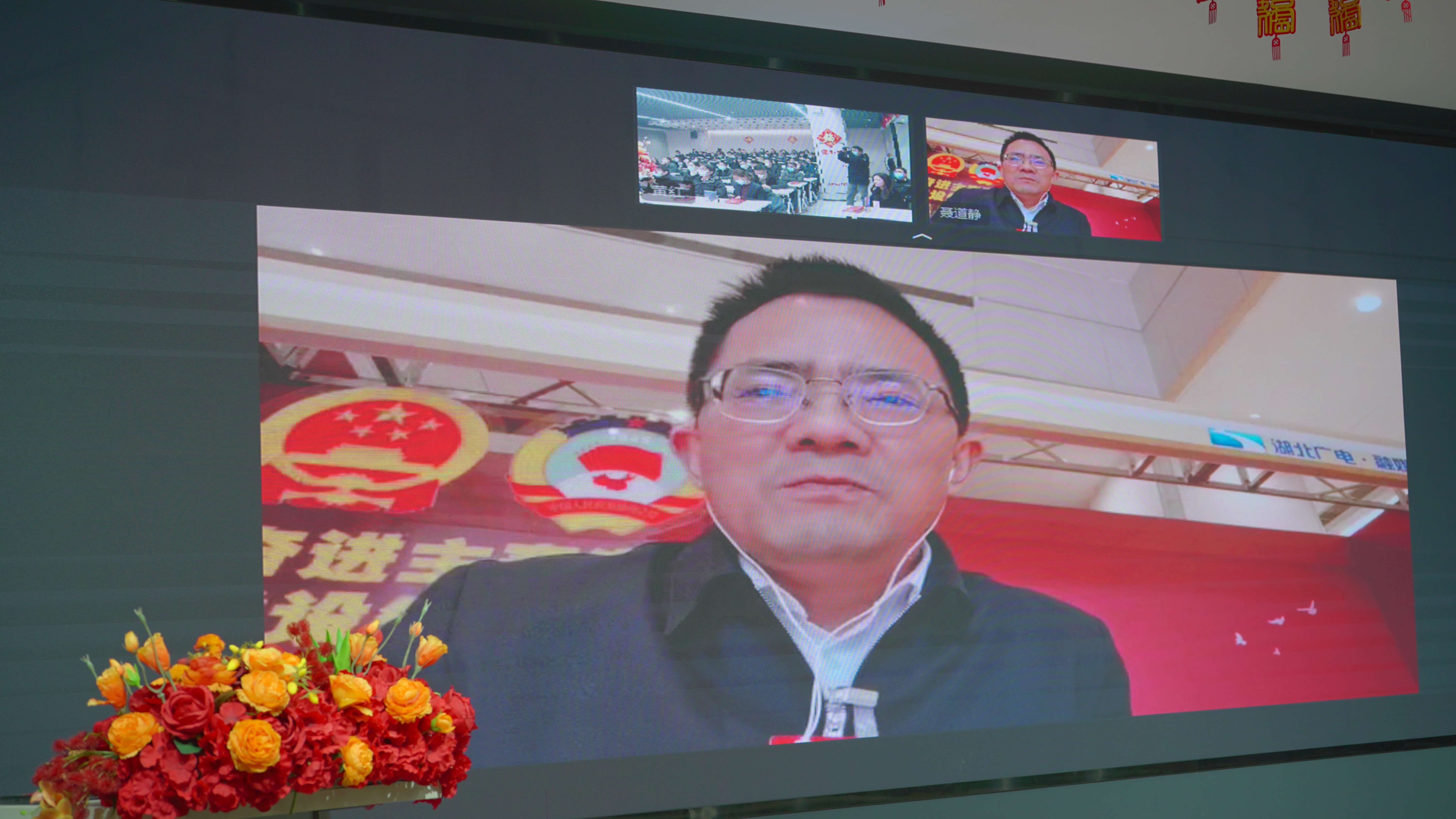 因為董事長聶道靜連任省人大代表,目前正在武漢參加湖北省第十四屆人民代表大會第一次會議,履行人大代表的職責工作,所以不能參加年終慶典。但他時刻心系家人,在人大會短暫的休息間他撥通視頻電話與年會現(xiàn)場進行了遠程連線。