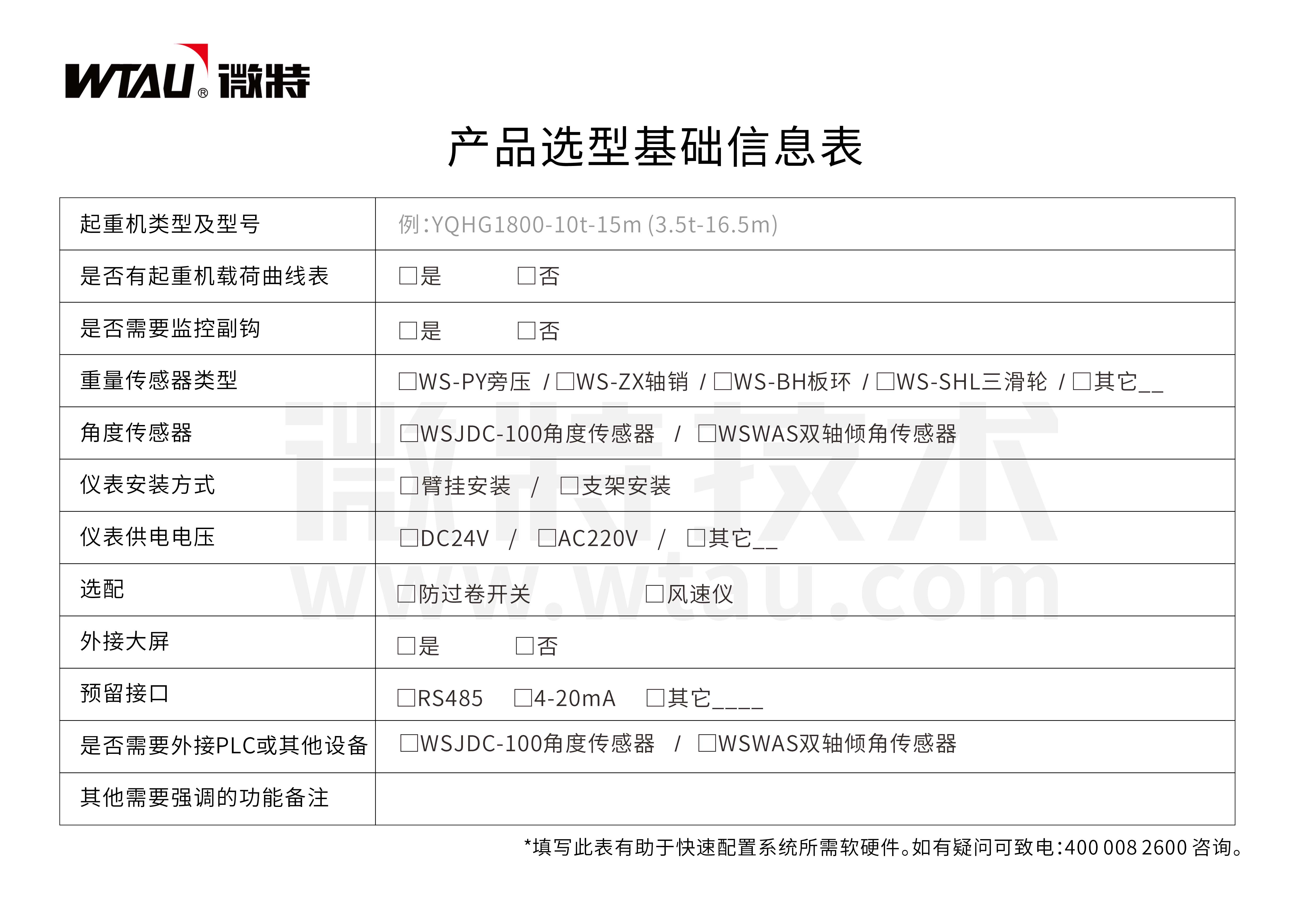 WT-W650V3型力矩限制器采用模塊化結(jié)構(gòu),由重量傳感器、角度傳感器、信號(hào)傳輸電纜、微電腦主機(jī)(含電源、顯示、信號(hào)處理)等部分組成。適用于在惡劣環(huán)境中運(yùn)行的工況復(fù)雜的起重設(shè)備。