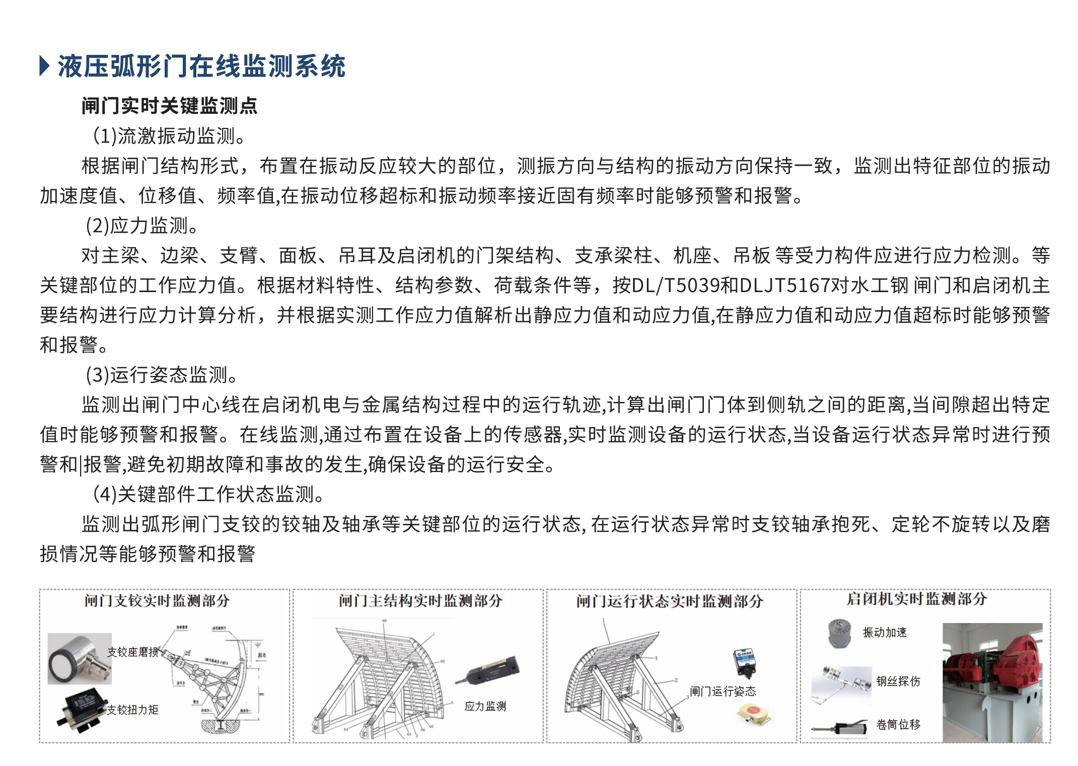 水工金屬結(jié)構(gòu)實時在線監(jiān)測的目的,是為研究水工金屬結(jié)構(gòu)失效的內(nèi)在原因,對水工金屬結(jié)構(gòu)的關(guān)鍵參數(shù)進行實時 監(jiān)測,進而建立起完整的水工金屬結(jié)構(gòu)實時在線監(jiān)測的安全評價體系。據(jù)相關(guān)數(shù)據(jù)統(tǒng)計,水工金屬結(jié)構(gòu)設(shè)備失事破壞的 主要形式有強度破壞、振動破壞、動力失穩(wěn)、結(jié)構(gòu)變形、主要部件失效等。